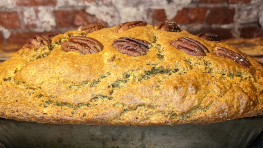 - Before mixing together wet and dry ingredients grease a 9 X 5 inch loaf pan and get pecans ready so the bread can be placed in oven immediately after combining. This will insure the no carbonation produced from the baking powder and baking soda is lost.