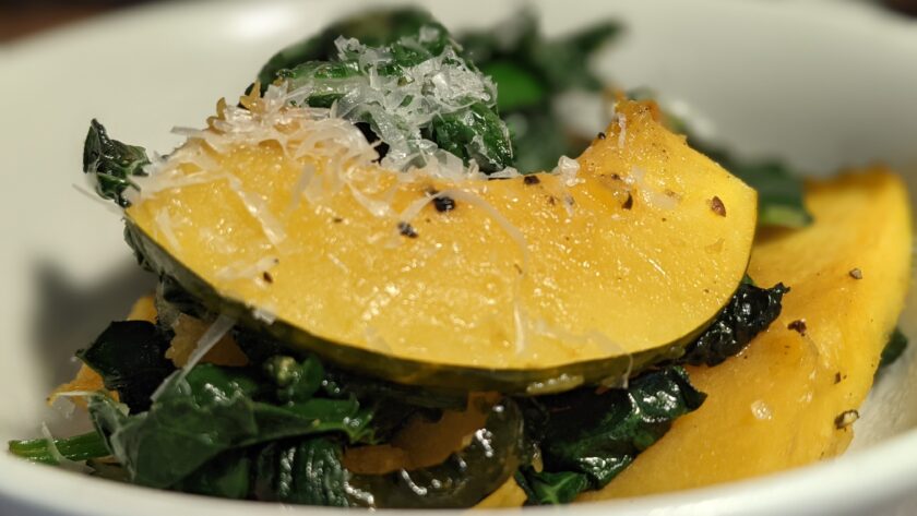 - Add Kale and sauté until tender. Stirring often. Season with salt and pepper. Turn off heat and wait until acorn squash is done.