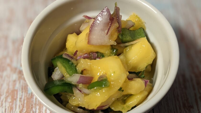 Updated on February 12, 2021February 7, 2021Salsa Sauce Vegan Mango Salsa Samantha 1 Comment on Mango Salsa This simple sauce is the perfect blend of sweet and spicy. Ingredients 1 mango, chopped 1 jalapeno, seeded and diced 1/2 red onion 1 lime, juiced and zested 2 tbsp cilantro Directions Combine all ingredients, season with salt, and refrigerate.